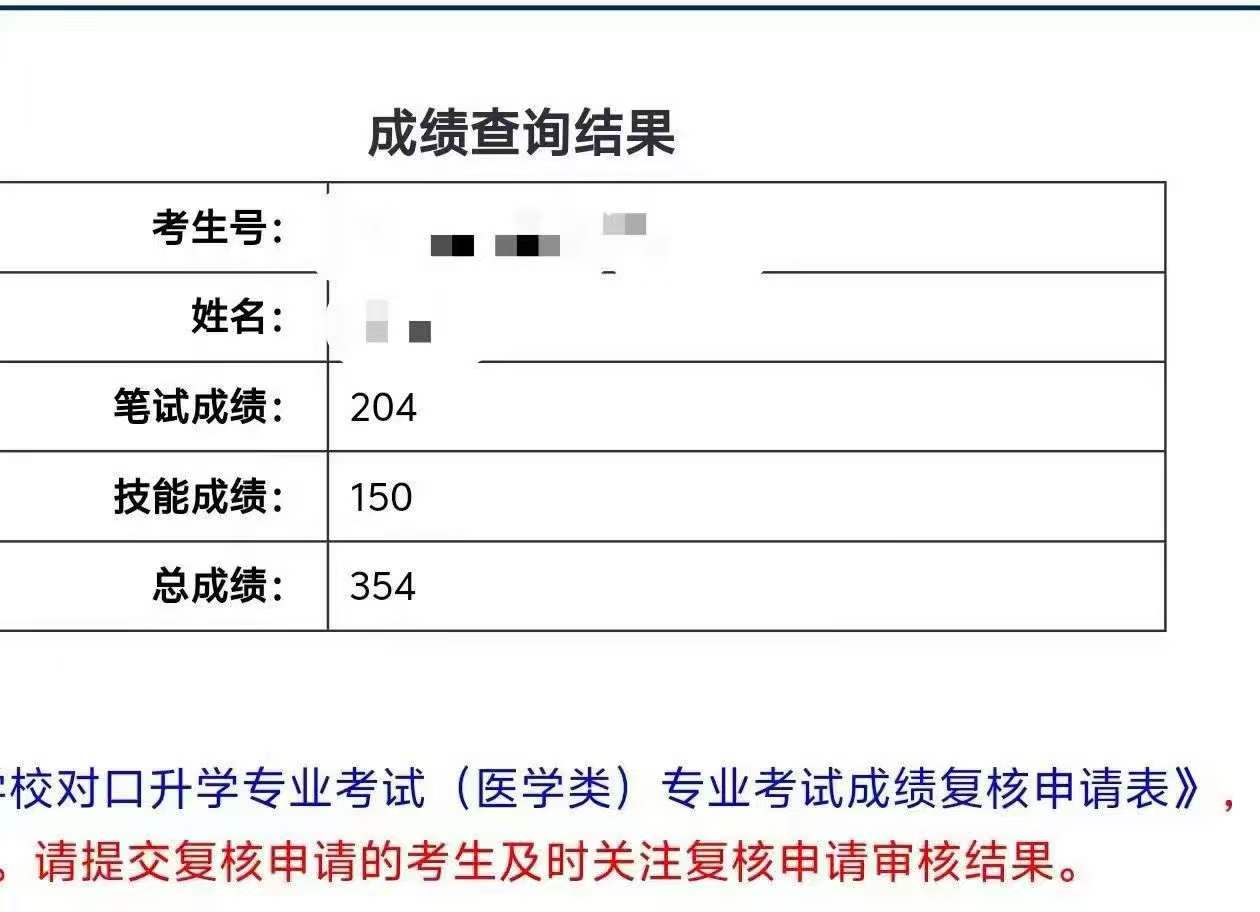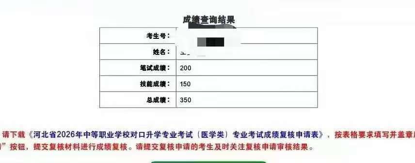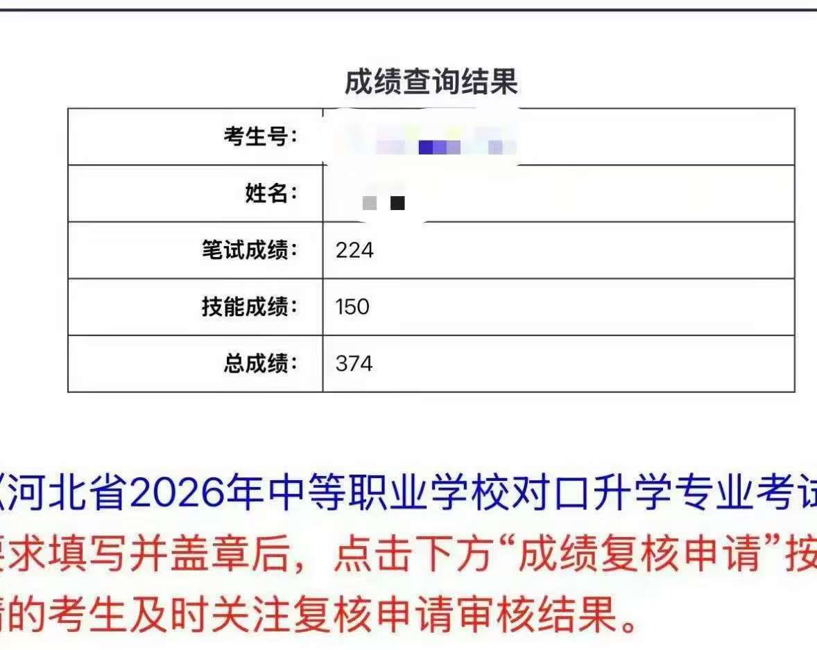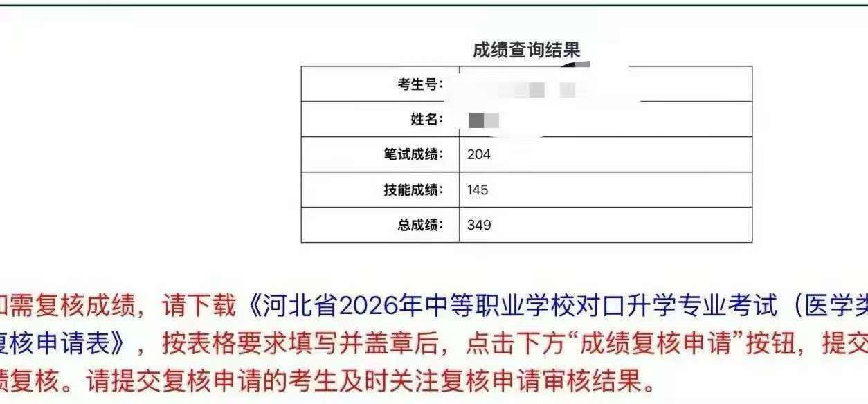 近日,河北省 2026 年中等职业学校对口升学专业考试(医学类)成绩公布,石家庄冀联医学中等专业学校学子不负众望、再创辉煌,多名同学取得优异成绩,用实力书写升学答卷,彰显了学校扎实的教学实力与育人成果! 从已公布的成绩来看,我校学子在本次考试中表现亮眼:多名同学笔试成绩突破 200 分,技能成绩满分 150 分的同学不在少数,总成绩 350 分以上的高分学子层出不穷,更有同学斩获 384 分的优异成绩,充分展现了冀联学子扎实的专业功底、过硬的实操能力与良好的应试素养。
