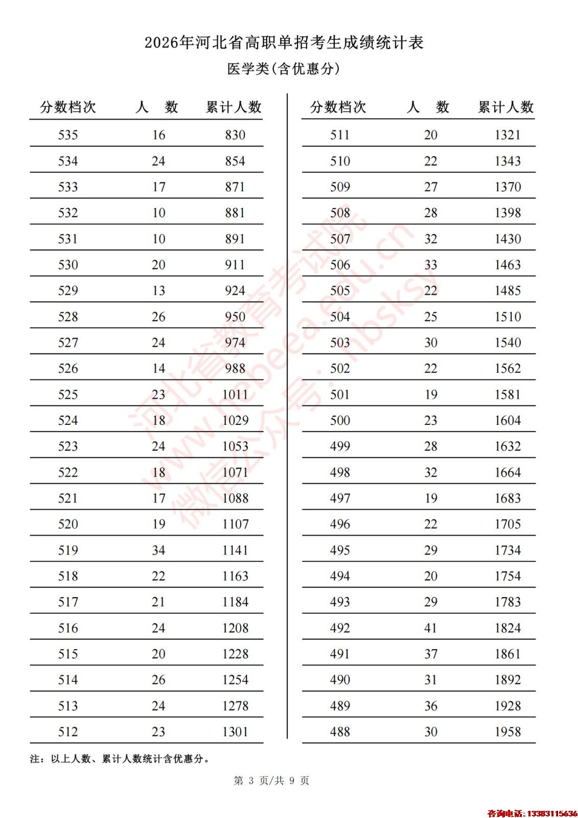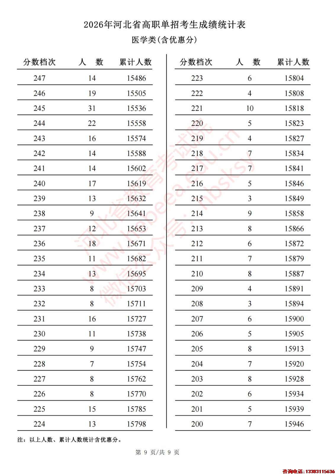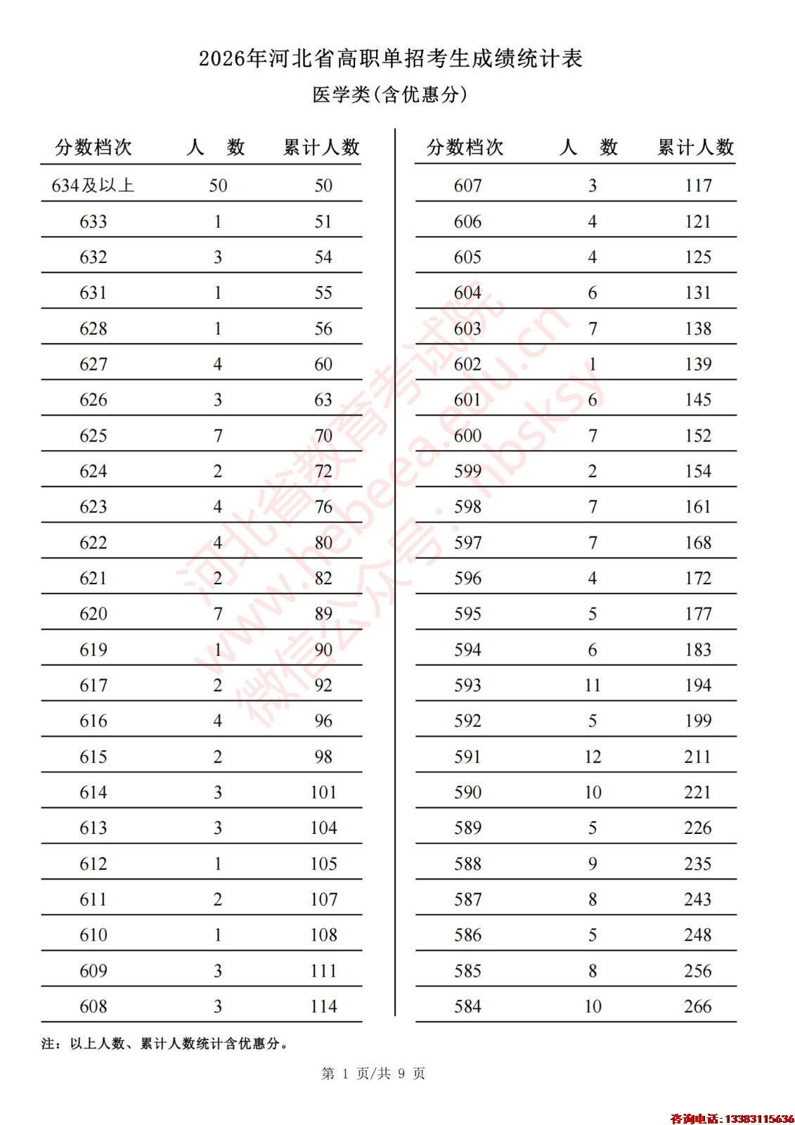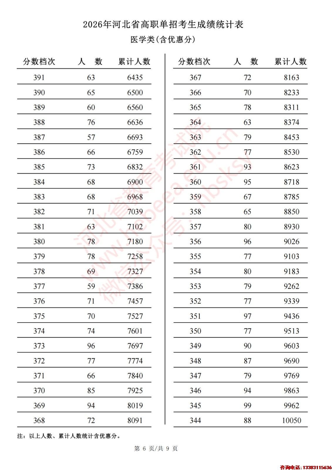 2026年河北省高职单招考生成绩统计表医学类(含优惠分)一分一档表