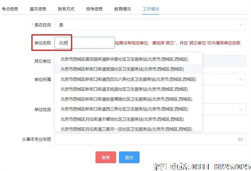 6.如实填写工作情况,“是否在岗”如选择“否”,则无需填写其它信息。 “单位名称”需要输入关键字(不可输入单位缩写、简称)检索后,在列表中选择相应单位,不可自行填写。