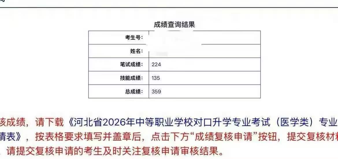 近日,河北省 2026 年中等职业学校对口升学专业考试(医学类)成绩公布,石家庄冀联医学中等专业学校学子不负众望、再创辉煌,多名同学取得优异成绩,用实力书写升学答卷,彰显了学校扎实的教学实力与育人成果! 从已公布的成绩来看,我校学子在本次考试中表现亮眼:多名同学笔试成绩突破 200 分,技能成绩满分 150 分的同学不在少数,总成绩 350 分以上的高分学子层出不穷,更有同学斩获 384 分的优异成绩,充分展现了冀联学子扎实的专业功底、过硬的实操能力与良好的应试素养。